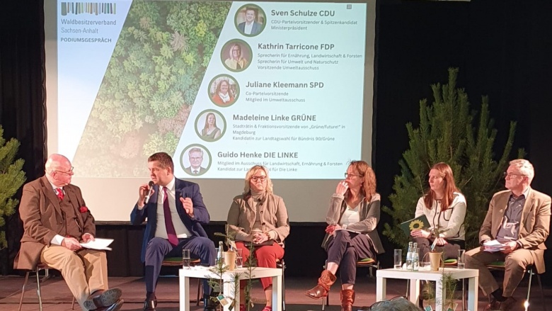 In der Podiumsdiskussion betonte Ministerpräsident und CDU-Spitzenkandidat Sven Schulze die große Bedeutung der Wälder und würdigte ausdrücklich die Arbeit sowie das Engagement der Mitglieder des Waldbesitzerverbandes Sachsen-Anhalt. Zudem sprach er über aktuelle forstpolitische Entwicklungen in Sachsen-Anhalt und auf europäischer Ebene.